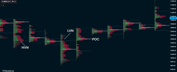 - ● Point of Control (POC): The single price level with the highest traded volume.