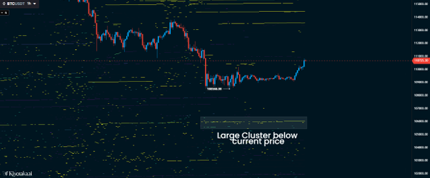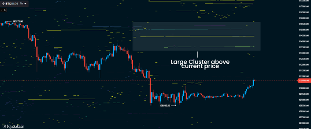 - ● Short liquidation zones: Above price, showing where overleveraged shorts could get squeezed.