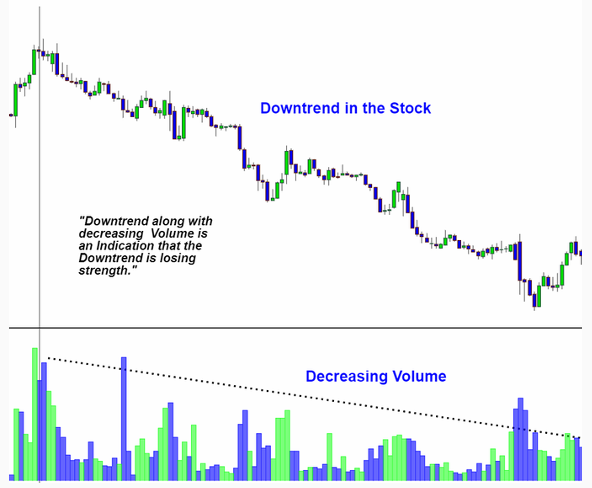 When volume is decreasing while price is also falling, it typically indicates a bearish trend with weakening momentum.