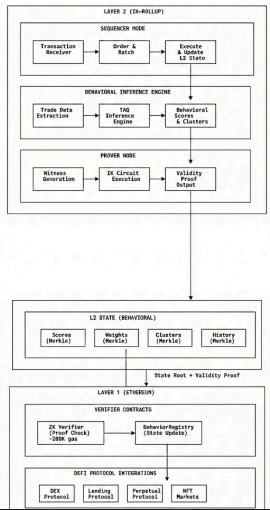 Layer 2 (Sequencer → Behavioral Inference Engine → Prover) → Layer 1 Verifier Contracts