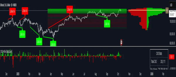 Figure 3: Bitcoin price chart with cumulative volume delta (CVD) profile showing bull/bear divergences, exemplifying the behavioral signals extracted from order flow data.